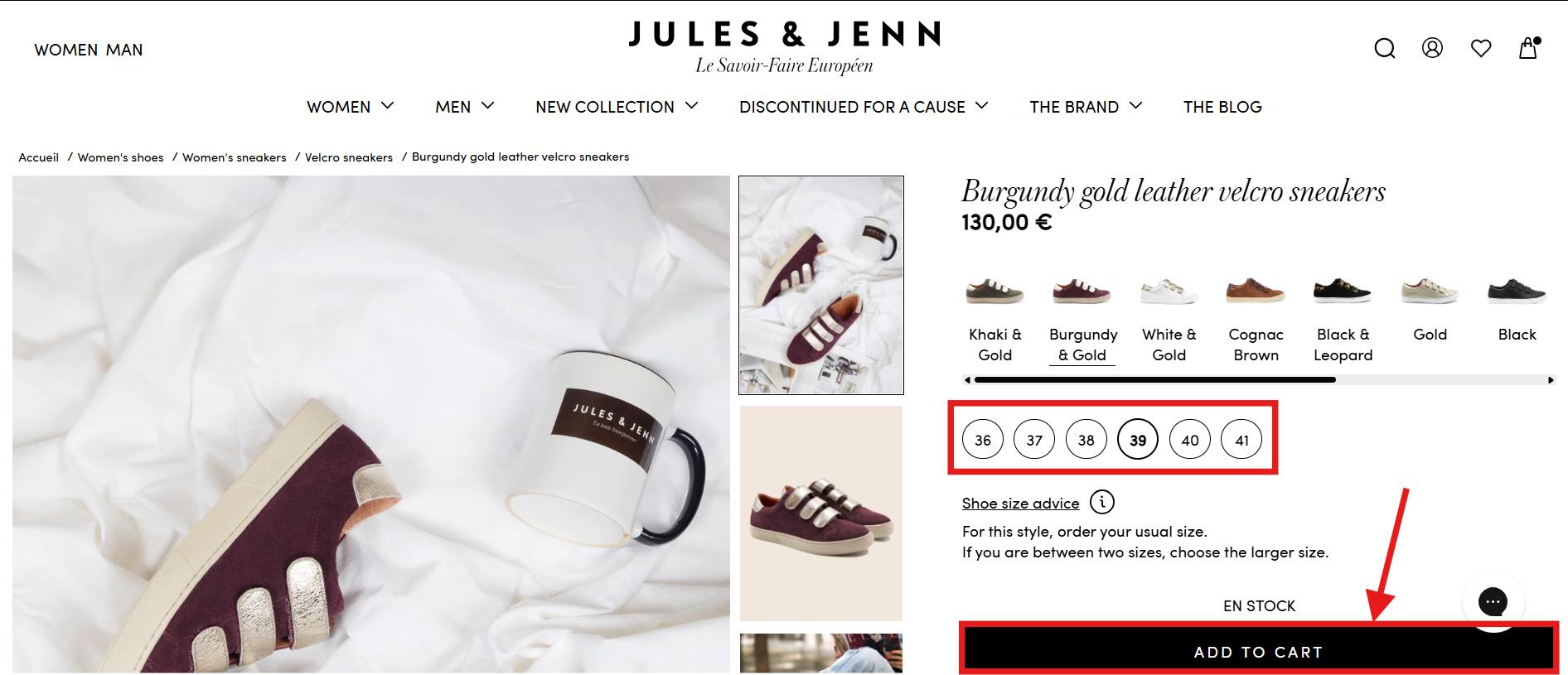 Go to your desired product page. First, choose the colour, then your size. Next, click on the "Add to cart" button.