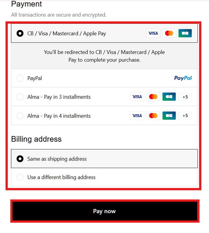 Choose your payment method and enter a different billing address if necessary. Finally, click on "Pay now" to complete the purchase.